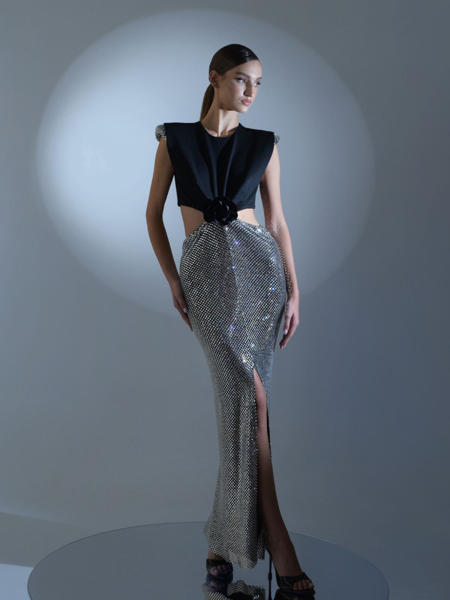 Aiffa dress is a harmonious blend of luxury, where the sumptuous top gracefully embraces you, setting the stage for the real star – the crystal-adorned skirt. Each crystal reflects the light, creating a mesmerizing dance that adds a touch of glamour to your every move. Perfect for a special event. Let your style shine with the enchanting marriage of crystals in this captivating dress.