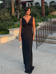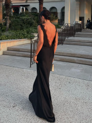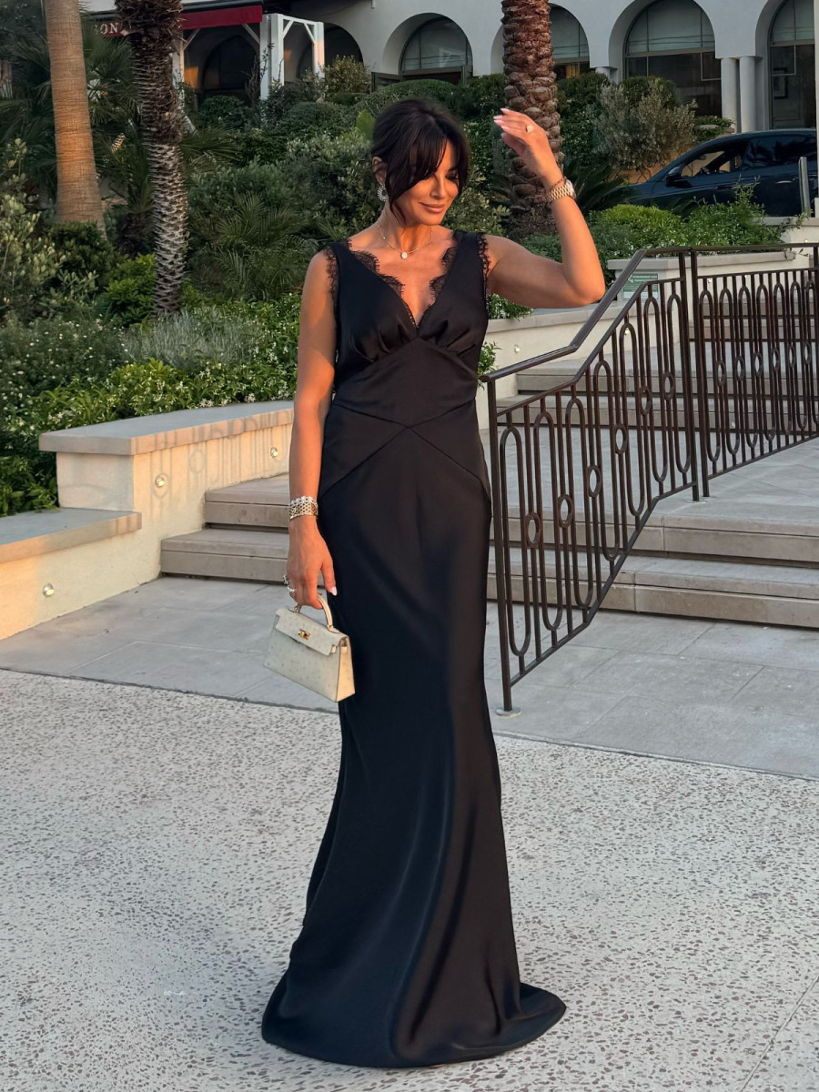 This elegant maxi dress features a stunning open back and a flattering V-neckline, exuding timeless sophistication and chic style. Delicate lace details add a touch of romance and refinement, making it perfect for formal occasions or evening events.
