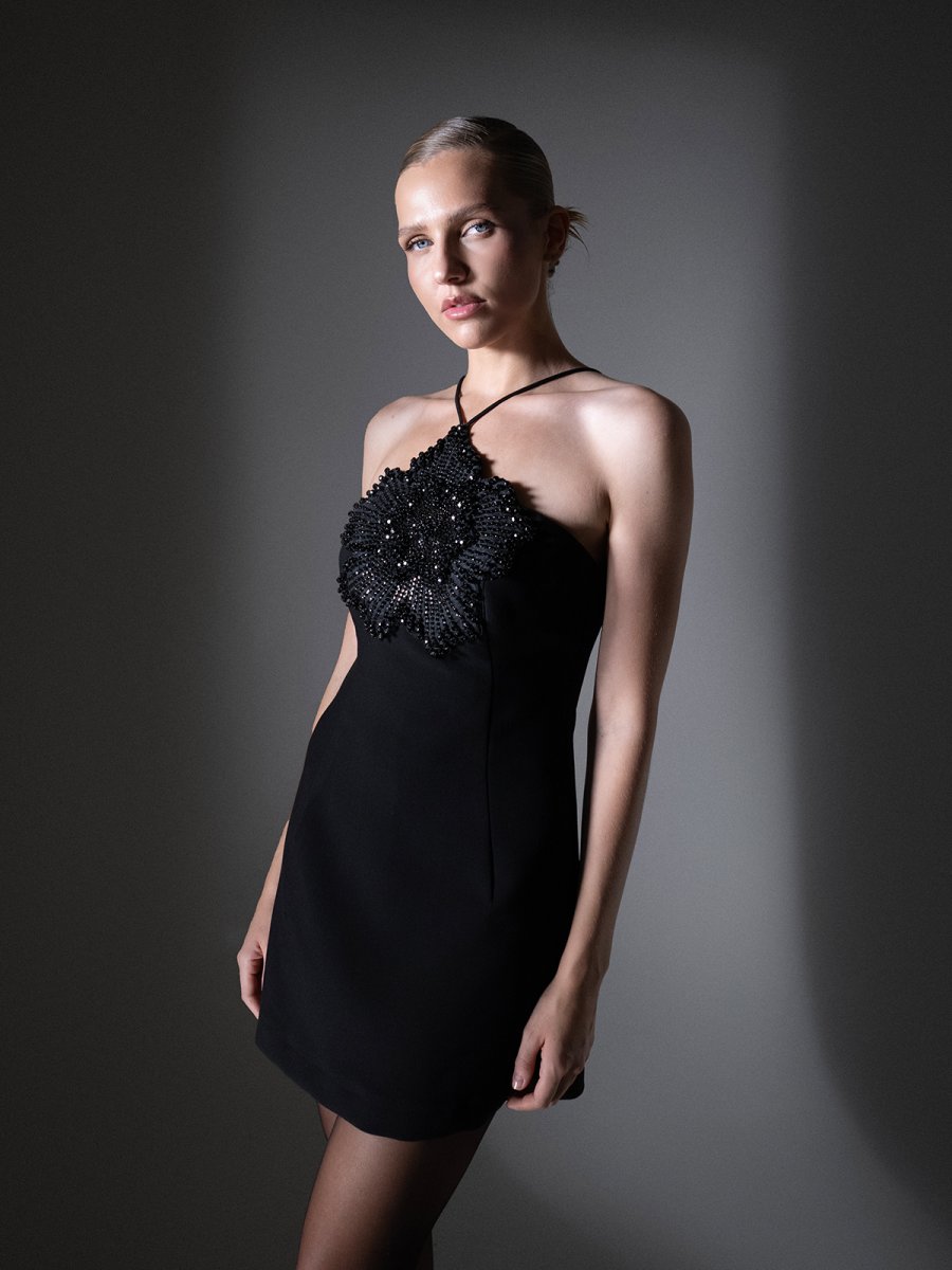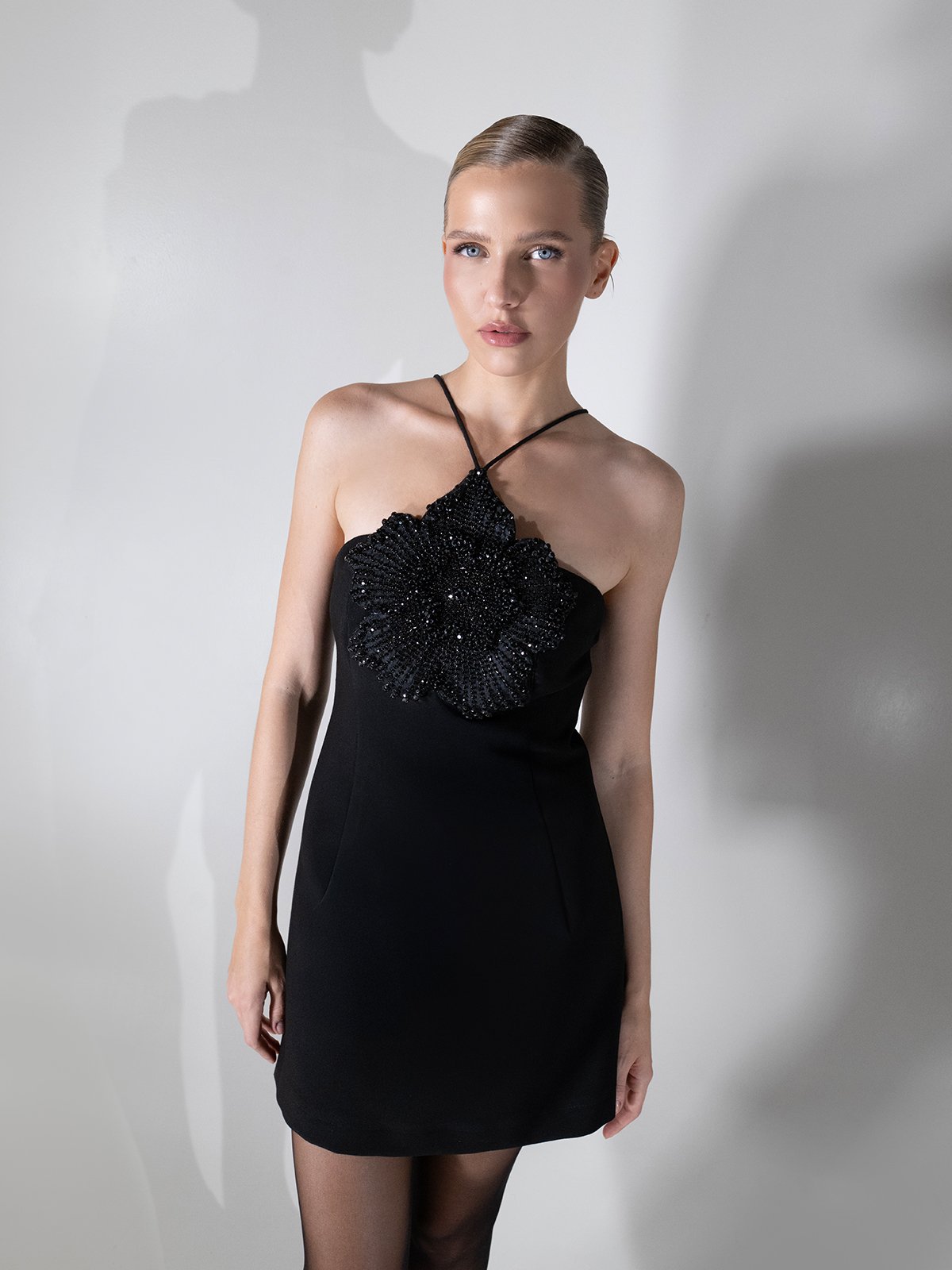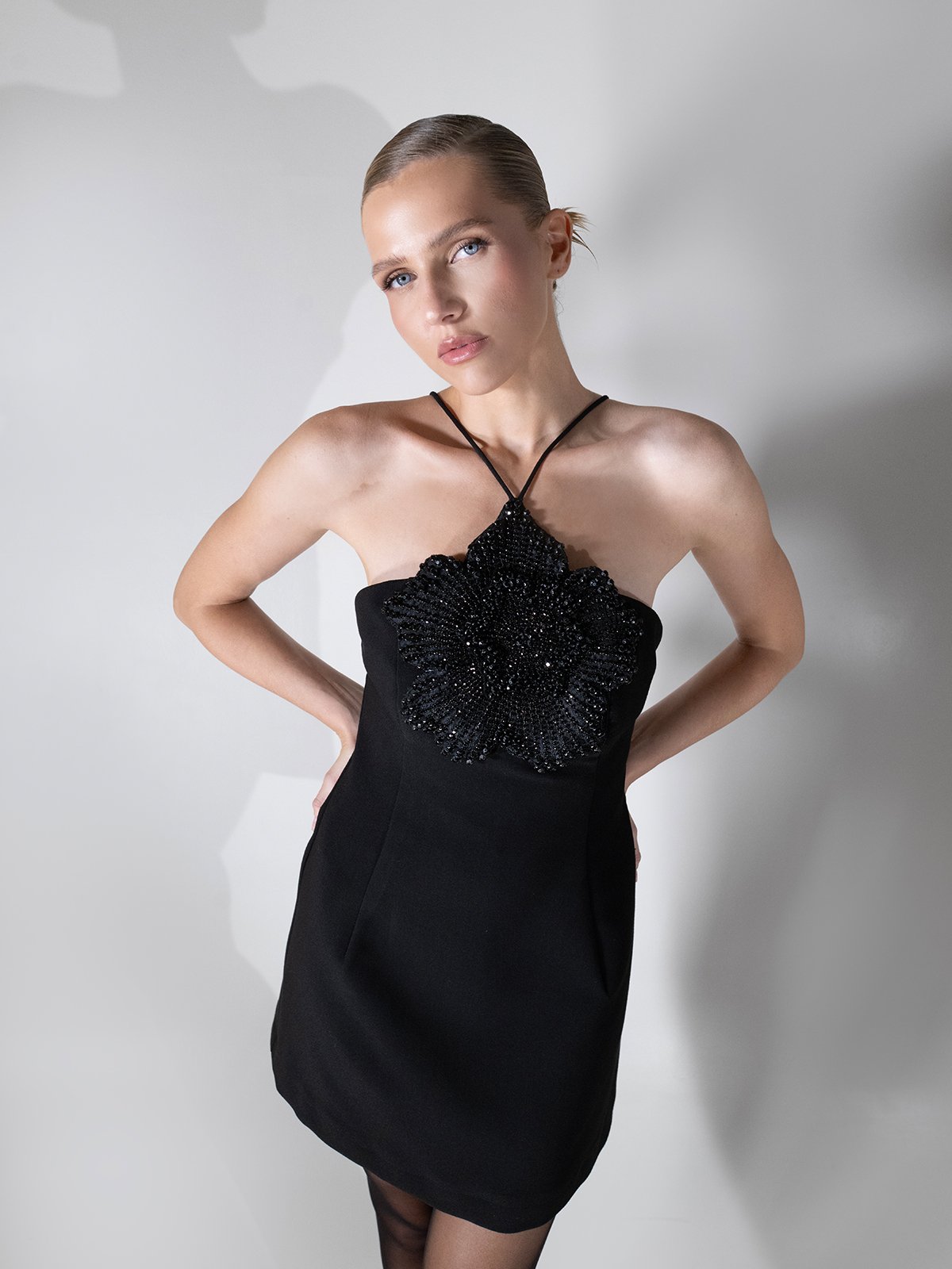 A striking little black dress crafted from smooth crepe, featuring a hand-embellished floral appliqué that draws all eyes to the neckline. Feminine, bold, and effortlessly elegant.